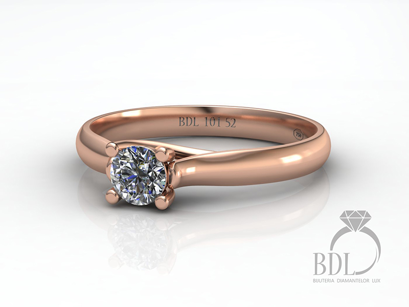 Inel de logodnă tip solitaire realizat din aur roz de 14 kt cu un diamant tăietură sub formă rotund briliant în setare 4 gheare
